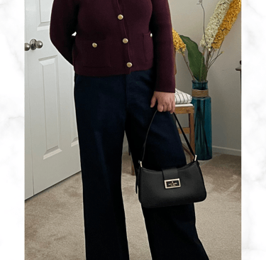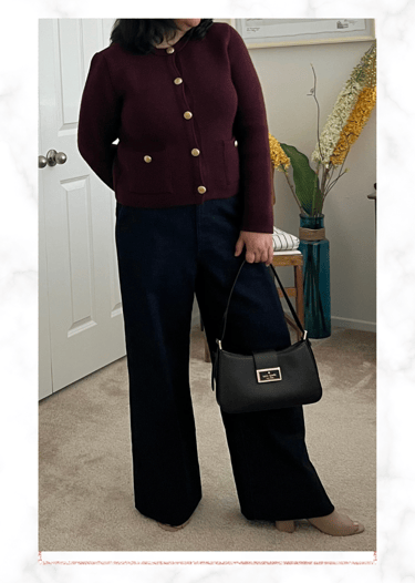 Wide-leg dark jeans instantly elevate your look. I styled mine with a classic maroon cardigan and sleek shooties for a polished vibe. This outfit works beautifully for a fall evening out—chic without trying too hard.