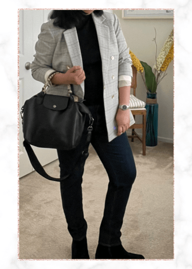 For those days when you want to look professional but not too formal, slim dark-wash jeans are a lifesaver. I paired mine with an oversized blazer, Chelsea ankle boots, and a structured black handbag. This look strikes the perfect balance between polished and approachable—ideal for an office meeting or a business lunch.