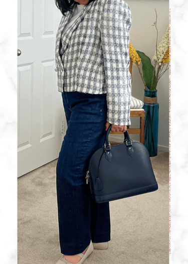 Straight-leg jeans are timeless, and you can easily dress them up for a clean, minimal style. I love pairing mine with a tweed jacket, ballet flats, and a medium-sized handbag. The result? A classic outfit that feels refined but never fussy.