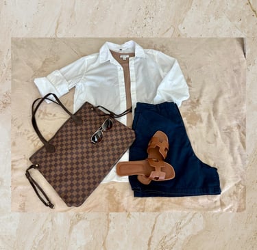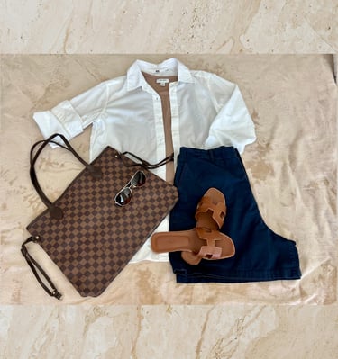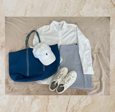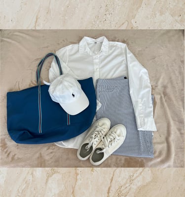 Some combos just feel like summer, and white with blue stripes is at the top of my list. I style mine with blue striped crop pants, comfy white sneakers, and a blue tote. Add a crisp white cap, and you’ve got a fresh, breezy, and comfortable outfit that’s ready for any sunny day adventure.